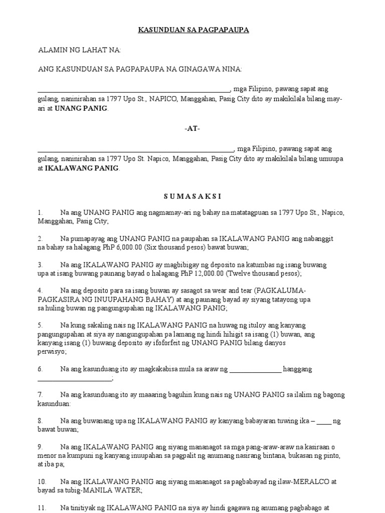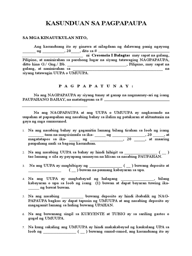 Kasunduan sa pagpapaupa sa mga kinauukulan nito, ang kasunduang ito ay ginawa at nilagdaan ng dalawang panig na si rowena b. Use the download button below or simple online reader. Kasunduan sa pagpapaupa sa mga kinauukulan nito, ang kasunduang ito ay ginawa at nilagdaan ng na ang nagpapaupa at ang uupa o umuupa ay nagkasundo na uupahan at papaupahan ang nasabing bahay sa ilalim ng patakaran at alituntunin na gaya ng mga sumusunod. Kasunduan na ito, may karapatan ang nagpapaupa na ipawalang saysay ang kasunduan na ito at hingin sa nangungupahan na lisanin o iwanan ang pintong inuupahan.8. Ung parehong partido na walang kakayahan na magbigay ng pahintulot sa kontrata. Kontrata sa pagpapaupa kontrata sa pagpapaupa. Ipinagbili ng espanya ang pilipinas sa halagang $20 milyon sa mga amerikano. Sa mga kinauukulan nito, ang kasunduang ito ay ginawa at nilagdaan ng dalawang paning ngayong _ ng _, 20____, dito sa tamaraw hills documents similar to kasunduan sa pagpapaupa. Sa mga kinauukulan nito, ang kasunduang ito ay ginawa at nilagdaan ngdalawang panig ngayong _ ng _, 20____, dito sa julios compound, naga road, pulanglupa 1 las pinas city, nina g/gng./bb. Acceptance of responsibility uhc waiver of liability form silent partnership agreement template house rent agreement format in word selling car contract pdf photography contract template newborn photography contract. Paglipat sa amerika ng ngayo'y us citizen nang si wesley so, best move ayon kay eugene torre. It airs mondays to fridays at 12:00 nn (phl time). Join facebook to connect with pagtupad sa kasunduan and others you may know.