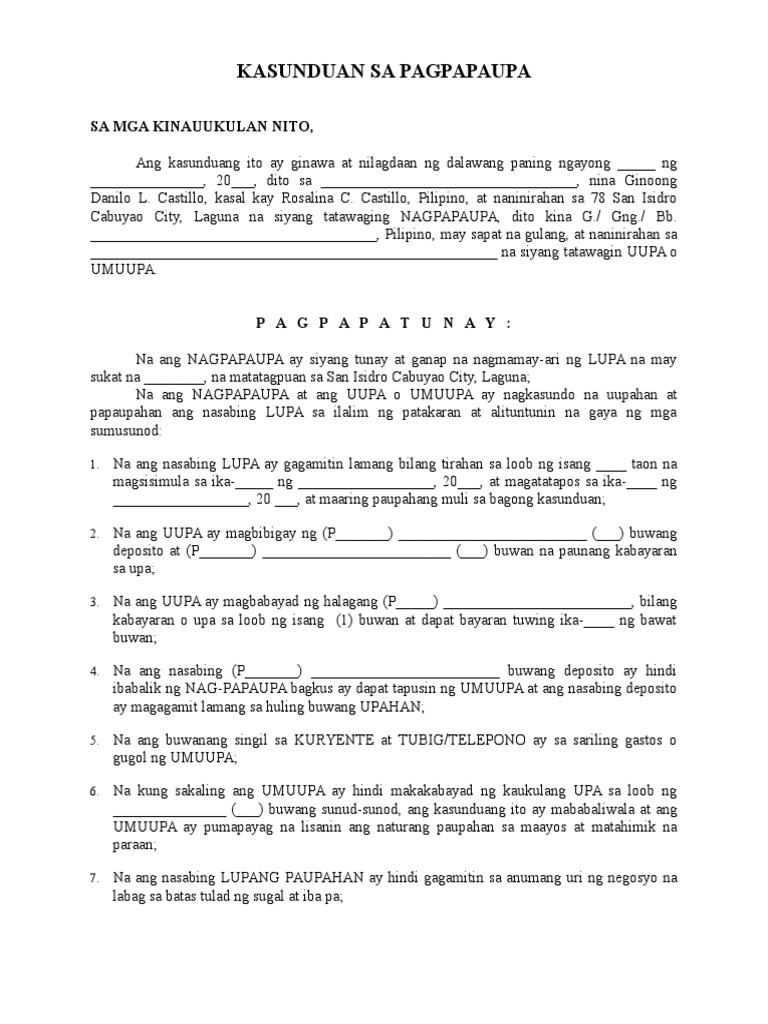 Sundin lamang ang mga hakbang na ipinakikita rito: Examples of samples contracts contract agreement form free printable. Ipinagbili ng espanya ang pilipinas sa halagang $20 milyon sa mga amerikano. Kasunduan sa pagpapaupa sa mga kinauukulan nito, ang kasunduang ito ay ginawa at nilagdaan ng dalawang paning ngayong _ ng _, 20____, dito sa tamaraw hills. Results for kasunduan sa pagpapaupa translation from tagalog to english.