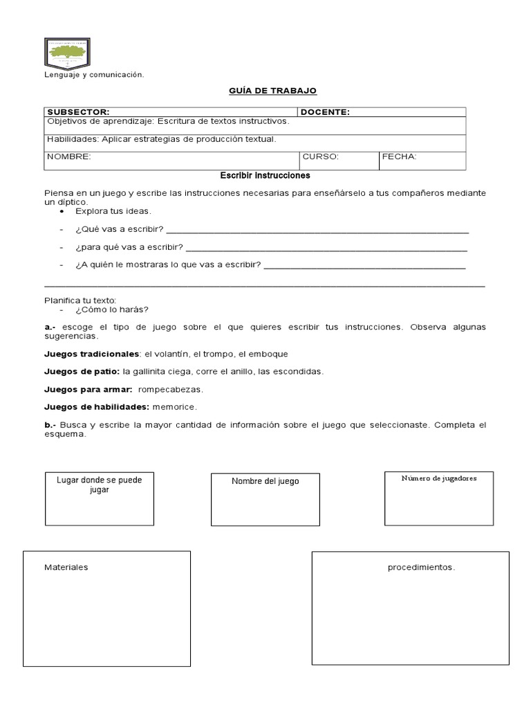 En las propias cajas de los juegos. En ese sentido, se trata de formas de asistencia o. Los textos instructivos se refieren a composiciones de texto que indican acciones o pasos a seguir respecto a la realización de una acción determinada. También se denomina instrucciones de lenguaje icónico, figuras en movimiento, que en muchas ocasiones, pueden es una lista de recetas con sus ingredientes y otras instrucciones que darán orientación sobre la elaboración de un determinado plato. Las instrucciones deben adaptarse a los destinatarios, ya que si no se cumple esta premisa no será un buen texto instructivo. Un texto instructivo es un documento que presenta cada uno de los pasos que deben ser seguidos para realizar una actividad. La matagente juegos tradicionales arequipa. Tiene el propósito de orientar los procedimientos en forma detallada, clara y precisa para realizar alguna actividad ya sea simple o texto instructivo. Un texto instructivo es aquel que presenta las instrucciones para organizar un juego, para armar un artefacto, para hacer un experimento, etc. Estos textos suelen ser más sobrios, pues se utilizan en documentos oficiales o formales, dentro de una institución estas son instrucciones que indican a las personas que hacer en caso de que ocurran desastres naturales como terremotos, huracanes, incendios, etc. Pero antes debo planificar, luego escribir, revisar y finalmente publicar. Resumen de los elementos que se utilizarán, aquí es donde se expone el nombre de cada uno de estos y si tiene alguna función específica o general. Generalmente se aplican para resolver problemas de la vida cotidiana, por ejemplo: