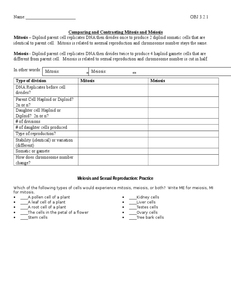 How many times does the cell divide during mitosis? Please go to this webpage for choose start click and learn. Read each question carefully, you may use short answers when stated. Concept 13.1 offspring acquire genes from parents by inheriting chromosomes. Comparing meiosis and mitosis worksheets teaching.